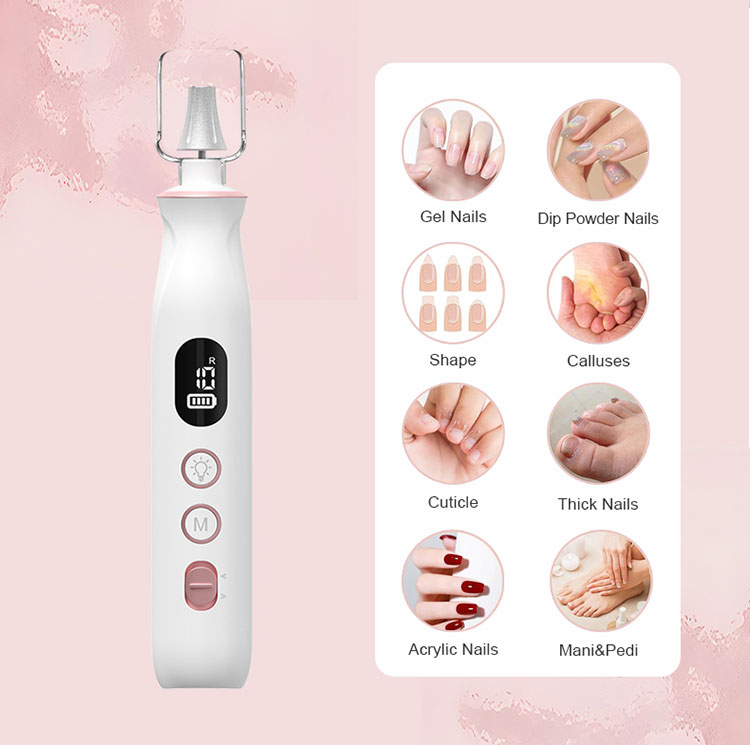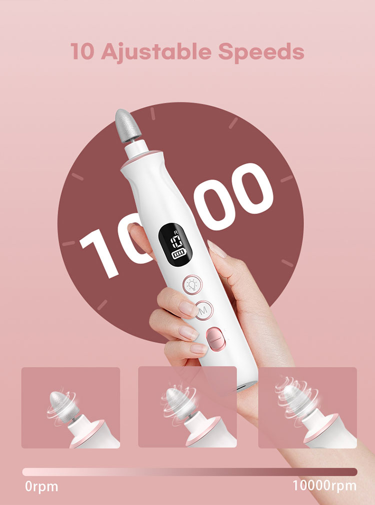 2:Powerful,10 Speeds & Dual Rotation, LCD Display, Memory Mode:This electric nail drill features 10 speed settings ranging from 2,700 to 20,000 RPM. It offers both clockwise and counterclockwise rotation, making it suitable for both left-handed and right-handed users. The LCD display clearly shows the speed levels, remaining power, and rotation direction. Additionally, the Memory Mode remembers the speed mode you last used for added convenience and customize your manicure and Pedicure mode